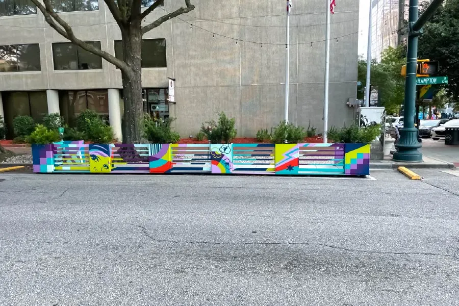 The College Park Parklet, began as summer pilot program to reactivate and reignite Mainstreet after 2020 restrictions. Local eateries needed help getting back on their feet and additional space to support patrons. Through the coordinated efforts of The College Park Mainstreet Association, City of College Park, participating restaurants, and local volunteers, the largest parklet in the Southeast was made possible. The “College Parklet” transformed nearly 100 feet of parking in front of the Real Milk and honey, Virgil's Gullah Kitchen and Bar, and Johny’s Chicken and Waffles into full-service restaurant patios, expanded outdoor workspace for The Forum, and created a bigger draw for businesses in the building painted by YoYo Ferro.